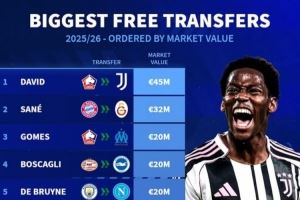 德转列今夏免签身价最贵榜:戴维&萨内领衔,德布劳内&托马斯在列